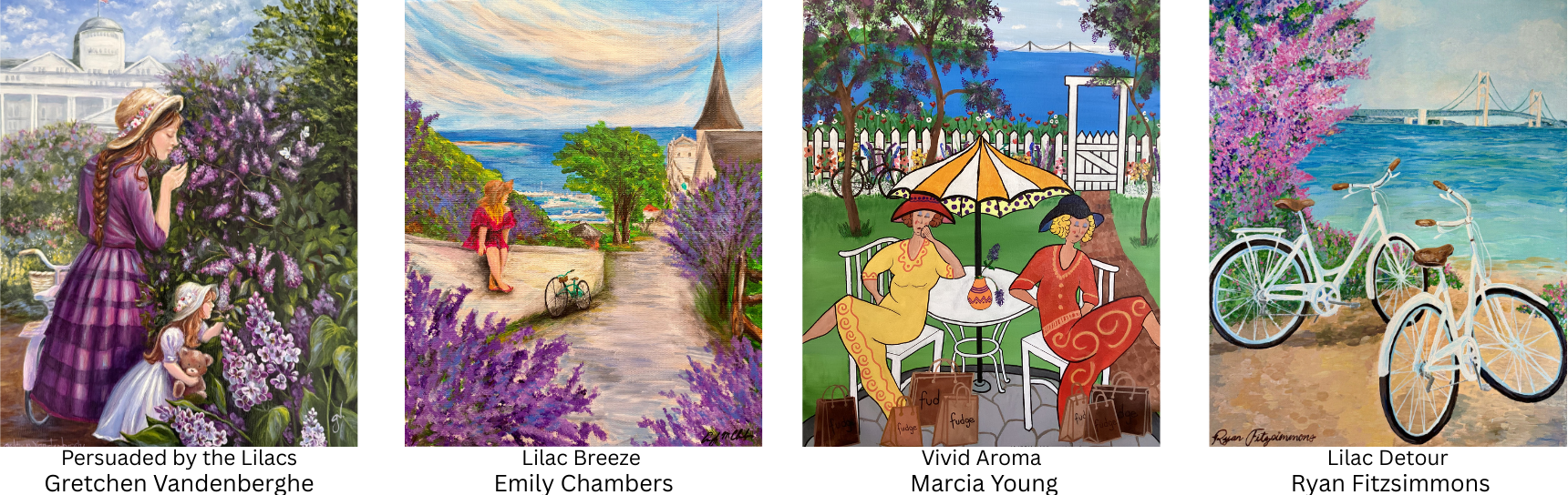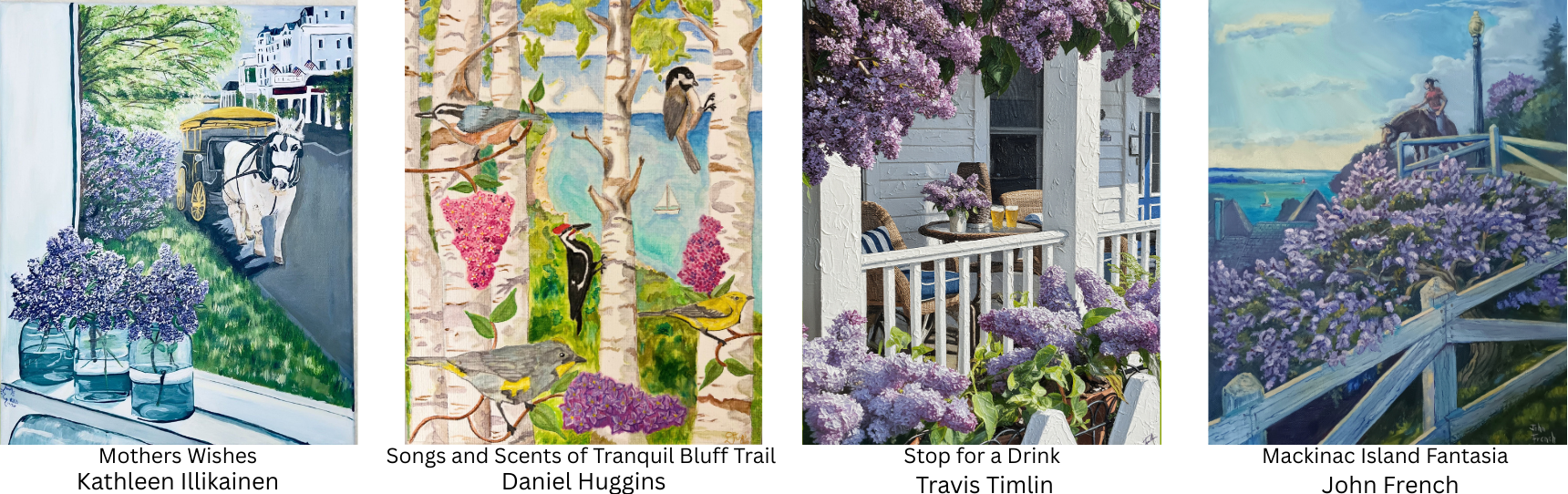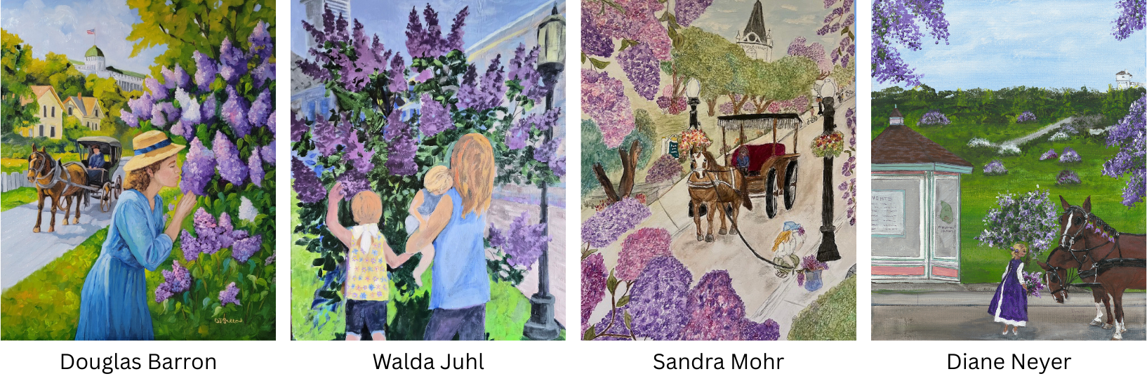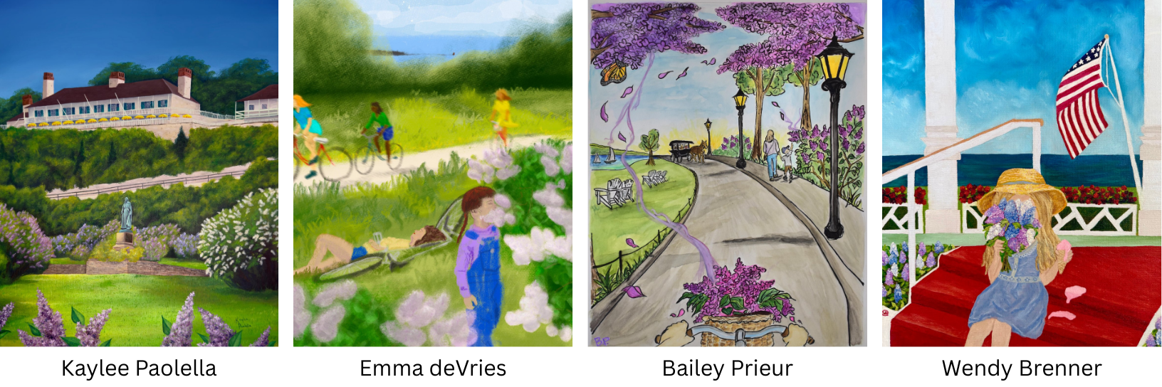 The Lilac Festival Poster Contest is an annual contest celebrating creativity, inviting artists from across the country to showcase their love for Mackinac Island and interpret that year's theme through different artistic mediums. The winning design is proudly displayed throughout the island during the Lilac Festival.